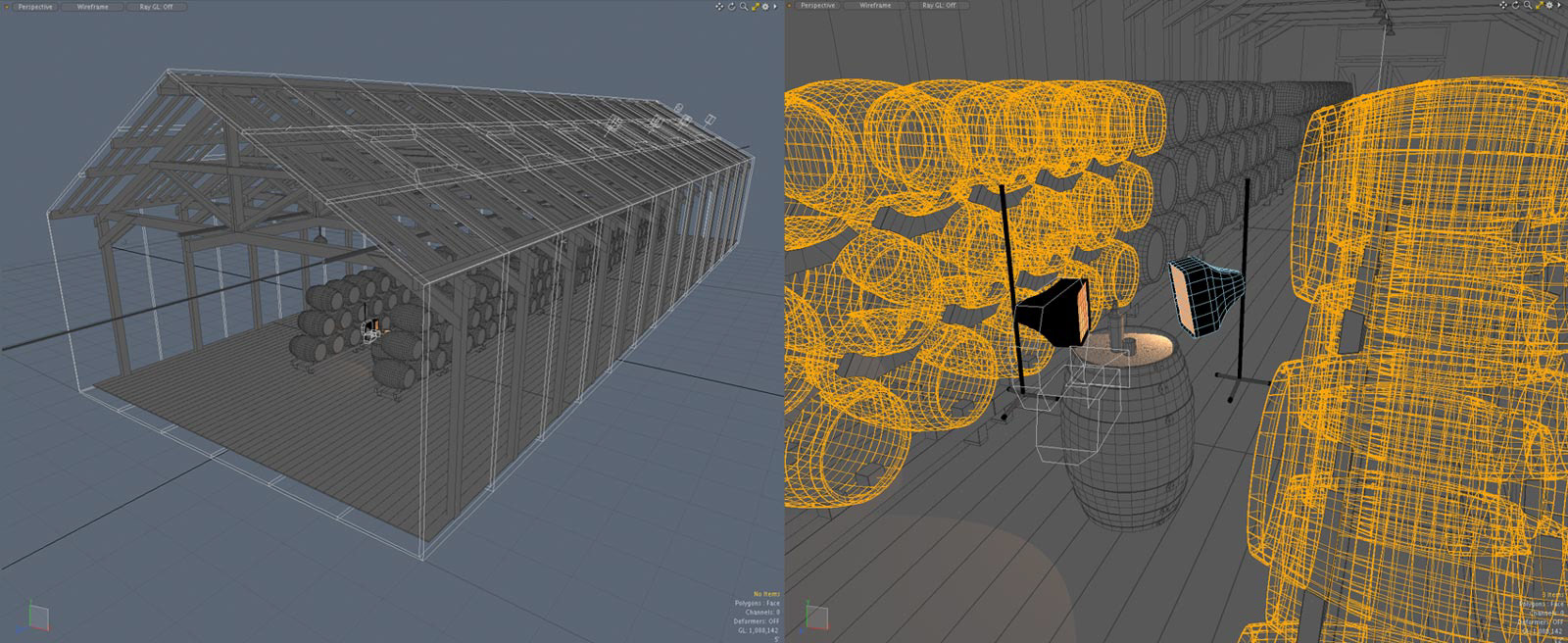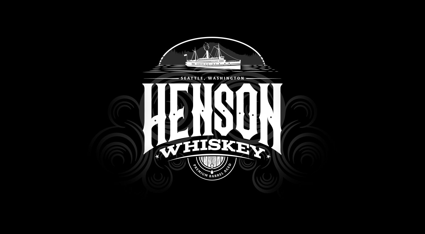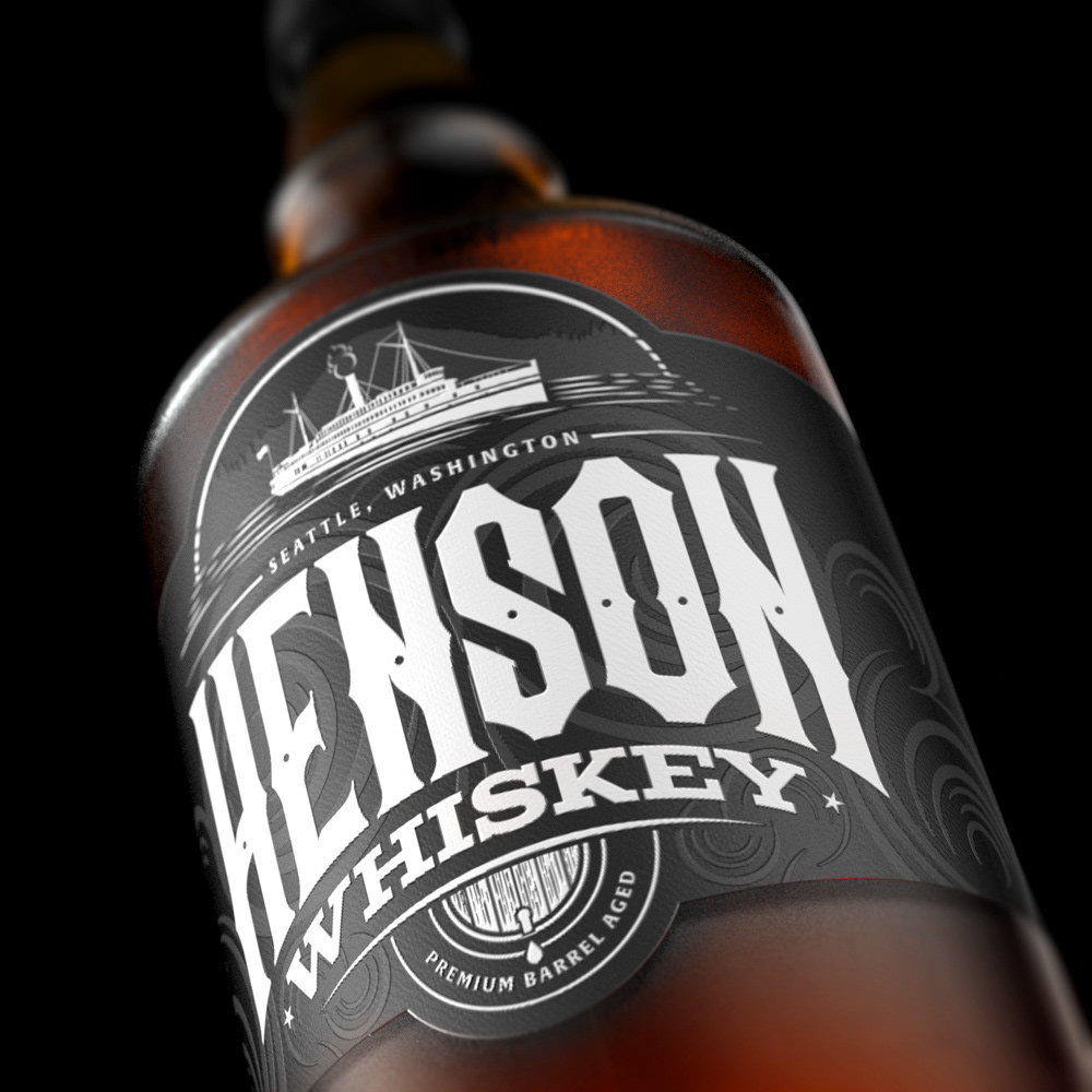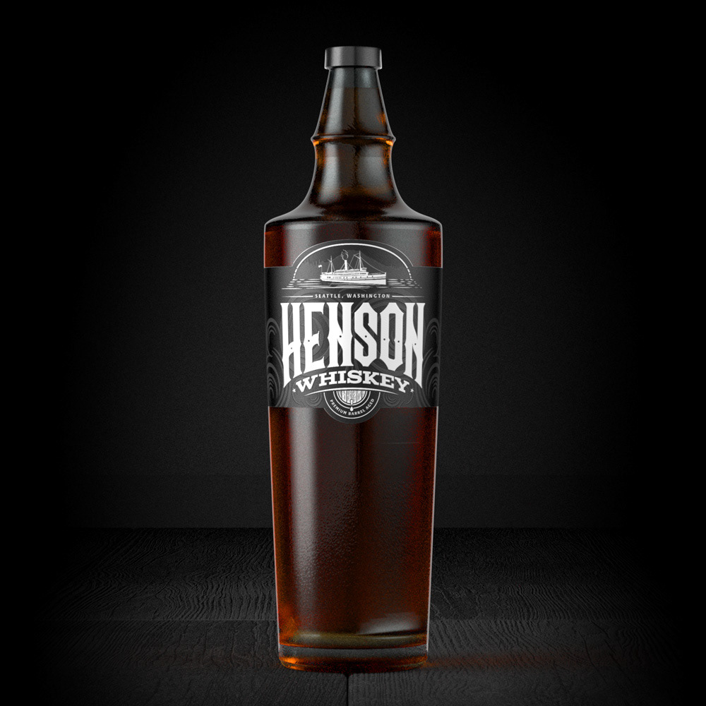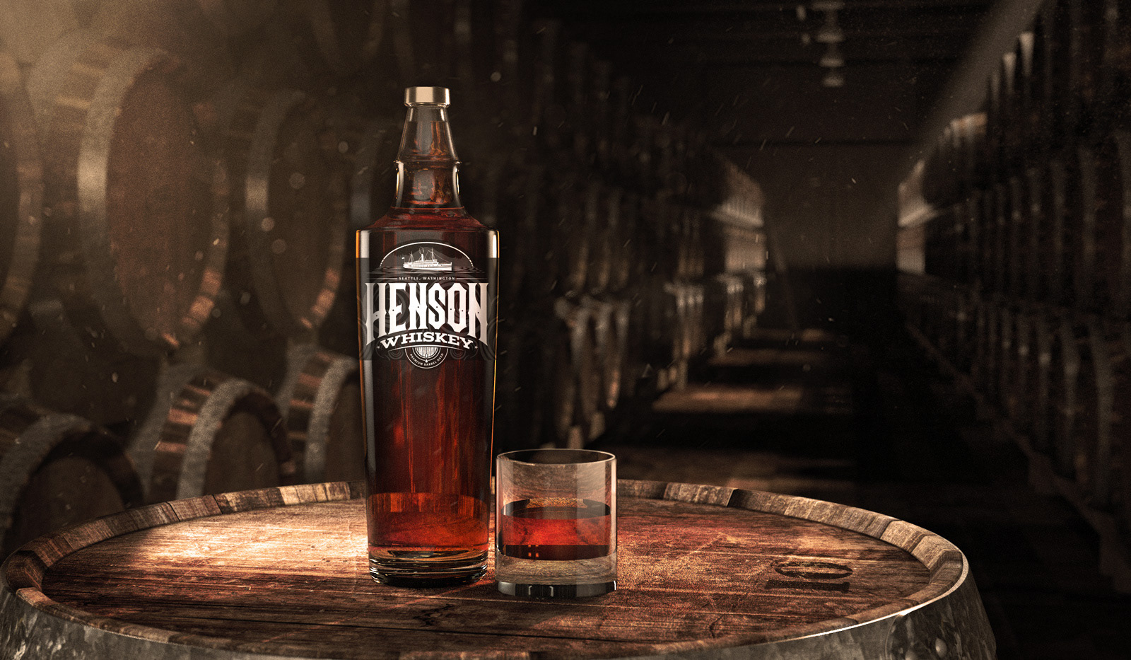 Henson Whiskey looked to position itself as a premium brand with roots going back to early 20th century Seattle and the steamers that moved people and goods across the bay. A custom hand drawn label design and bottle design were created to help tell the story of the brand. The barrel room visual was completely modeled, lit and rendered in Modo with further post production in Photoshop.